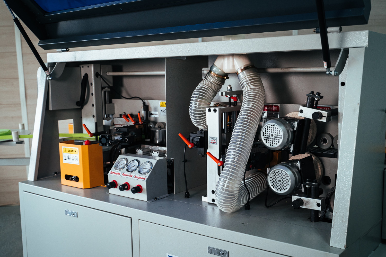 Два двигателя с полировальными кругами имеют регулировку по вертикали и горизонтали для точного позиционирования фетра в зону обработки кромочного материала.