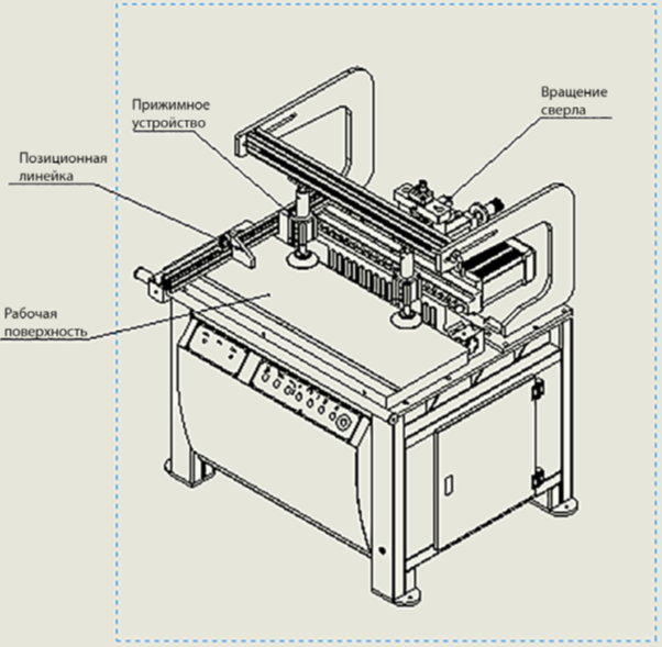 Конструкция сверлильной головы позволяет производить как вертикальное сверление (сверление в пласть), так и горизонтальное сверление заготовки (сверление в торец), а так же сверление под углом в 45°.